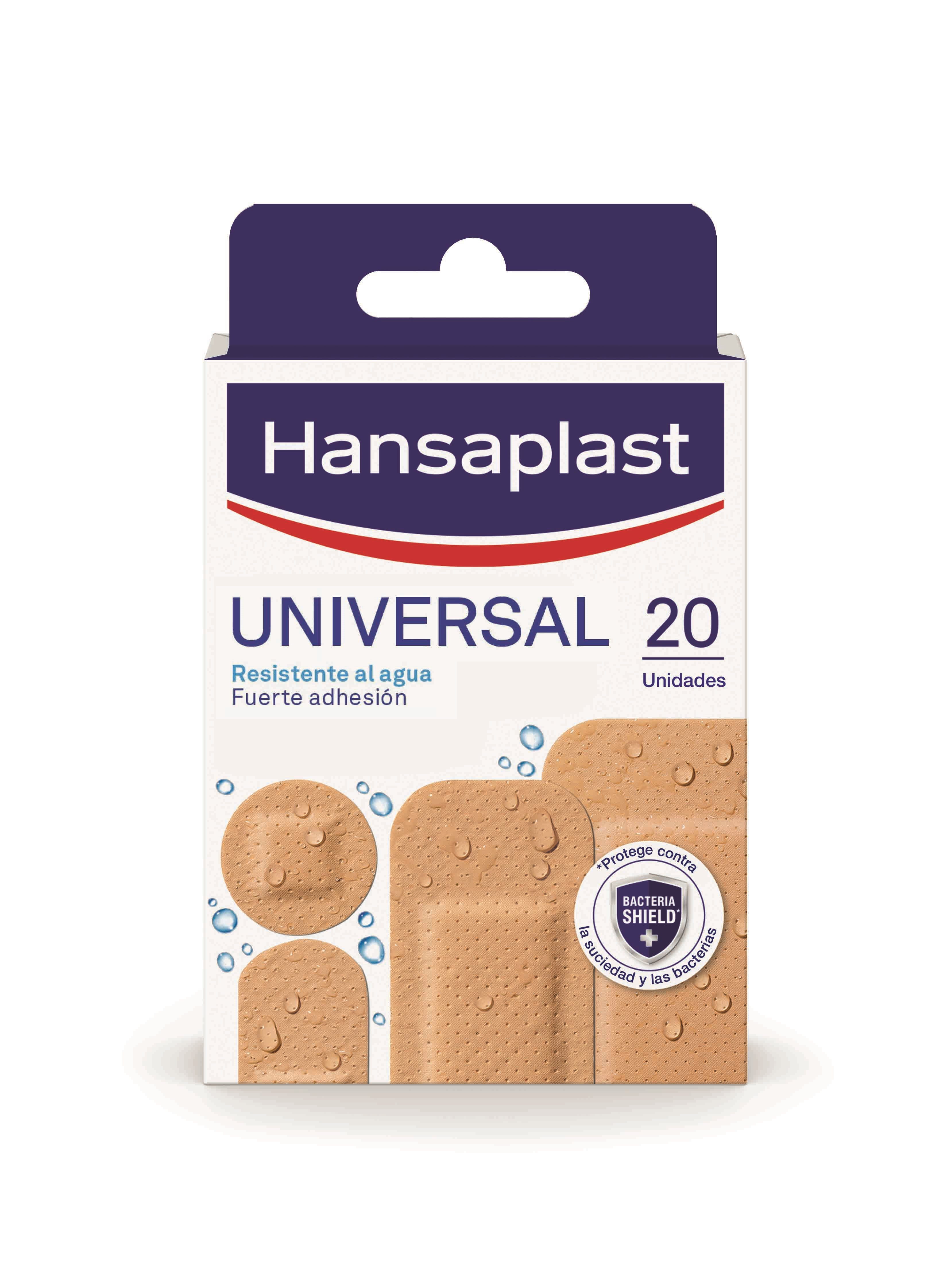 Hansaplast Universal Os pensos Hansaplast Universal são adequados para a cobertura e proteção de todos os tipos de feridas mais pequenas. Image *Os pensos Hansaplast bloqueiam contra sujidade e bactérias. O material é respirável e resistente à água. A compressa não aderente protege e amortece a ferida. A forte adesividade garante que o penso fica seguro no lugar. Os pensos estão disponíveis: como bandas em diferentes tamanhos que cobrem toda a ferida e o tamanho do curativo pode ser cortado consoante o tamanho pretendido